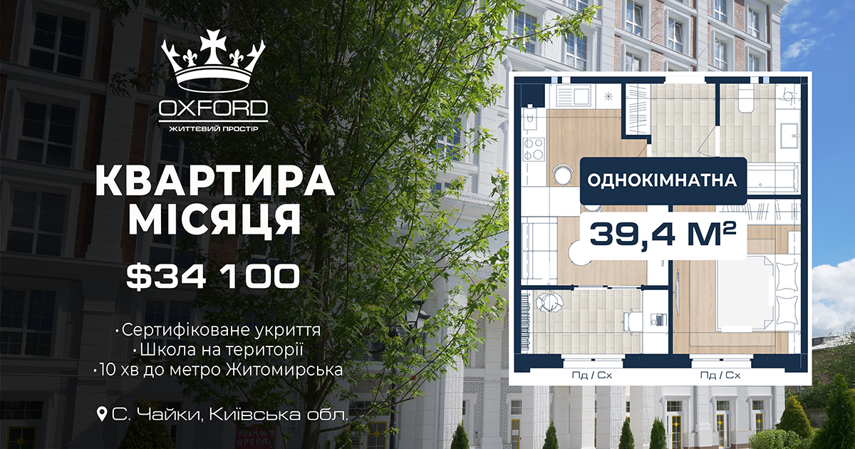 У самому серці с. Чайки (Київська область), всього за 10-15 хвилин від метро “Житомирська”, зростає житловий комплекс, що поєднує ритм міста та затишок передмістя. ЖК Oxford — це не просто будинки, а продуманий життєвий простір. Ми подбали, щоб купити квартиру в новобудові було комфортно для родин: від фасадів, оздоблених клінкерною плиткою, до наявності нової державної школи (відкриття у 2025 році) всього за 5 хвилин пішки.
